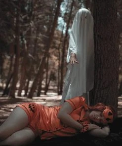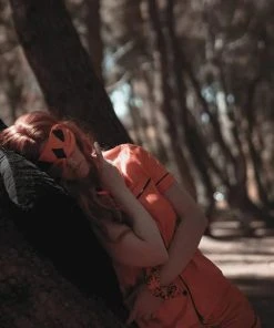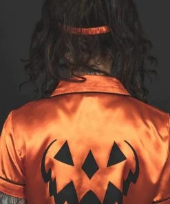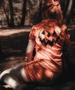 Front: Orange fabric + our Haunted Hallows Pumpkin Face (bottoms). Top ~ oversized button-up bodice, accented with a patch pocket.