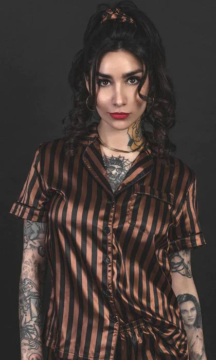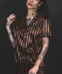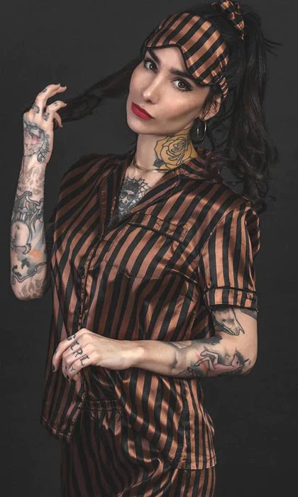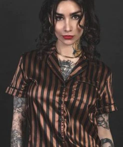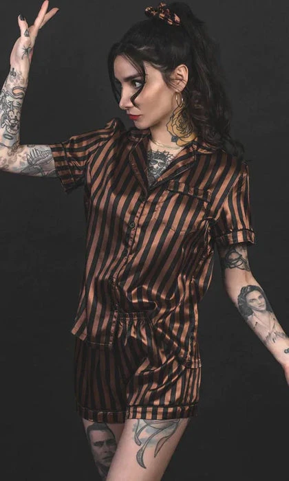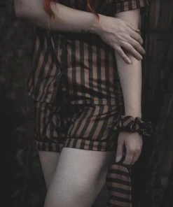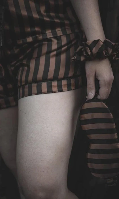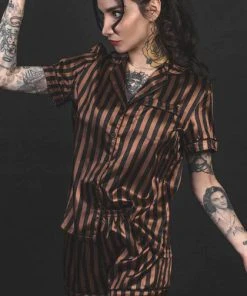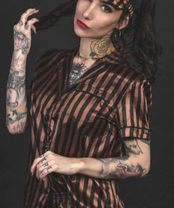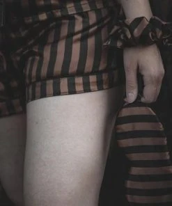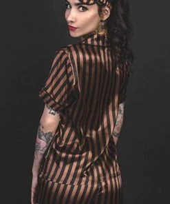 Front: Black & brown striped fabric. Top ~ oversized button-up bodice, accented with a patch pocket.