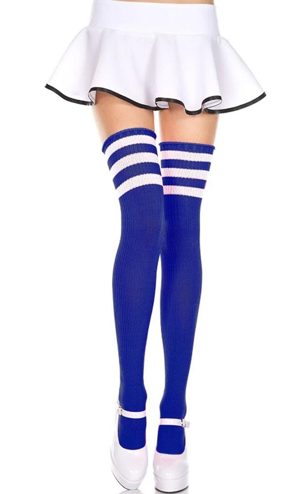 The Athletic Striped Royal Blue and White Thigh Highs by Music Legs are the perfect addition to any outfit, costume, or cosplay. These thigh highs feature white stripes at the top on a royal blue background.