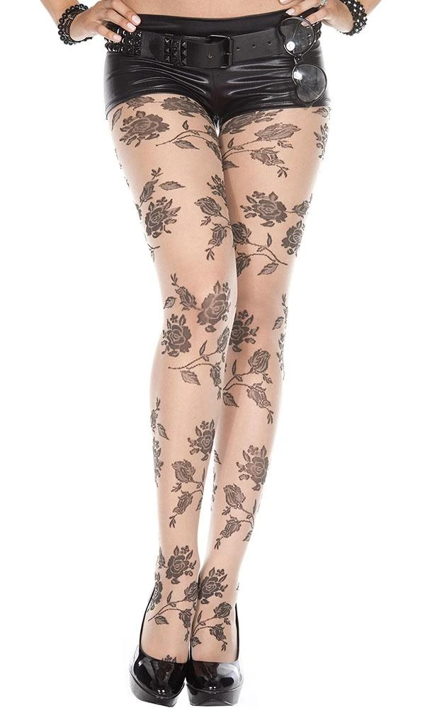 These beautiful pantyhose feature a black rose print on a beige background. Wear these under a dress or skirt to enhance any outfit!