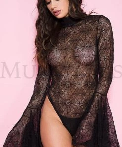 Add a touch of goth drama to any outfit with this Spider web lace teddy. Featuring long flare sleeves and a gorgeous spiderweb design, this teddy looks stunning paired with flares and platforms.