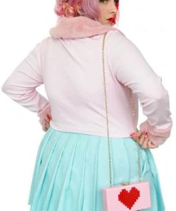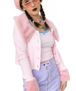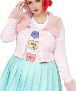 Lightweight rib knit fabric with faux fur trim and heart shaped buttons.