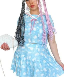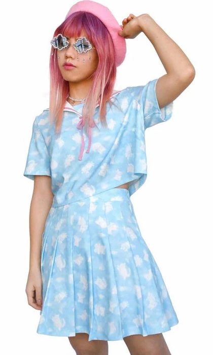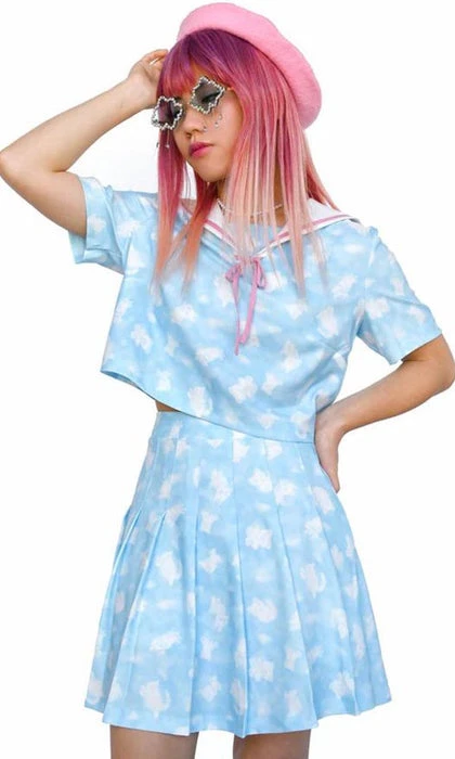 An animal cloud print on a sky blue sailor top with white and pink sailor collar.