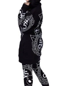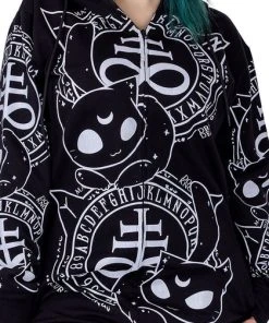 Cats are a goth’s best friend! So why not sport this super cozy longline kitty hoodie all winter long!? Covered in white witchy kitty motifs this hoodie is purrfect for all your witches and cool cats!