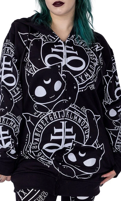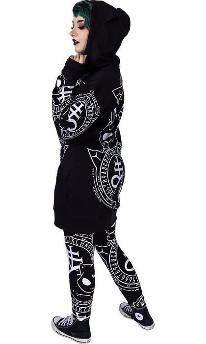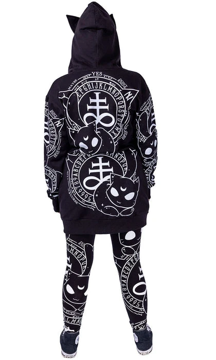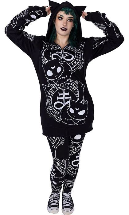 Cats are a goth’s best friend! So why not sport this super cozy longline kitty hoodie all winter long!? Covered in white witchy kitty motifs this hoodie is purrfect for all your witches and cool cats!