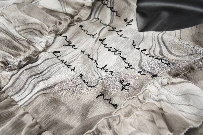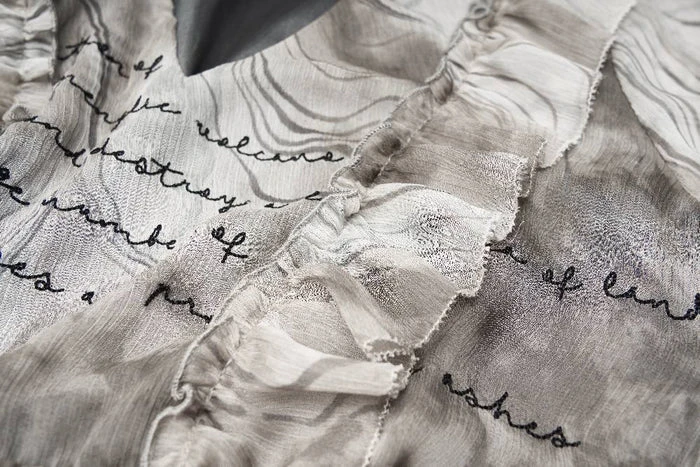 Text on dress reads: The eruption of menglie volcano will swallow up and destroy a large area of lands, burning lives and property to ashes