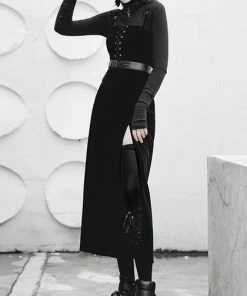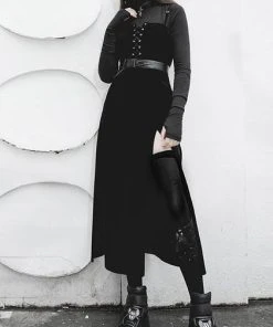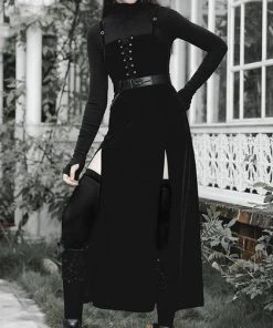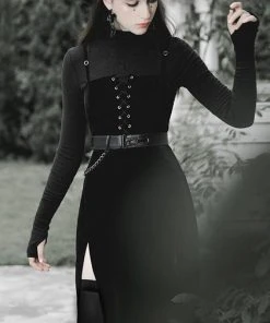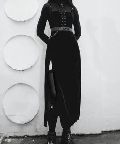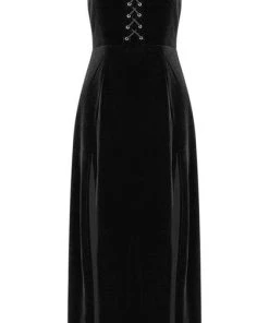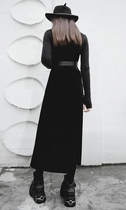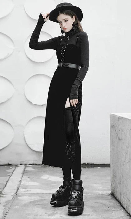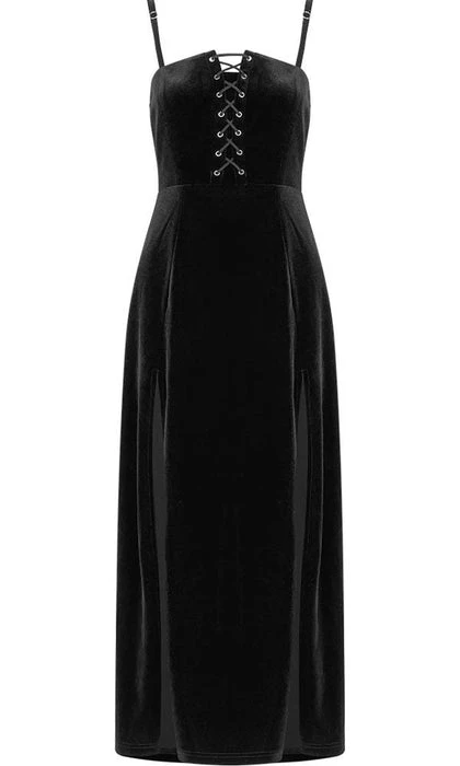 Dangerously soft velvet, intricate corset lacing and enchanting cut out panelling create this stunning velvet dress! Featuring seductive front slits and adjustable straps, it pairs perfectly with a black mesh long sleeved top and statement witchy boots!