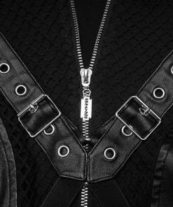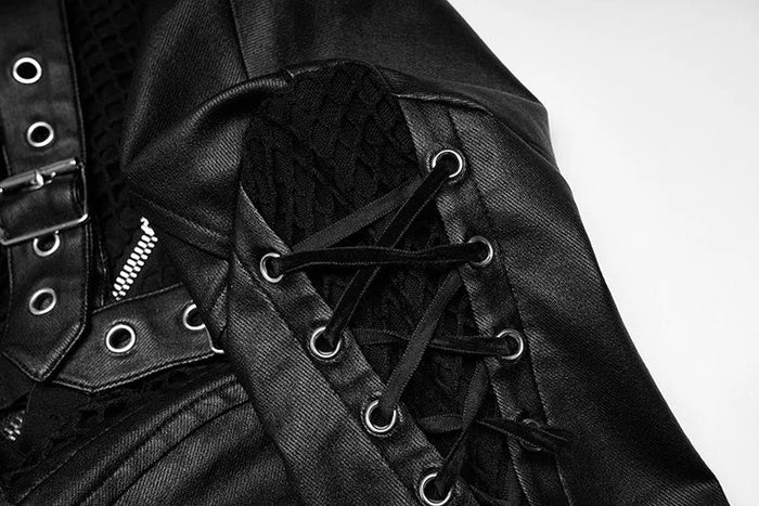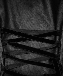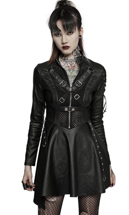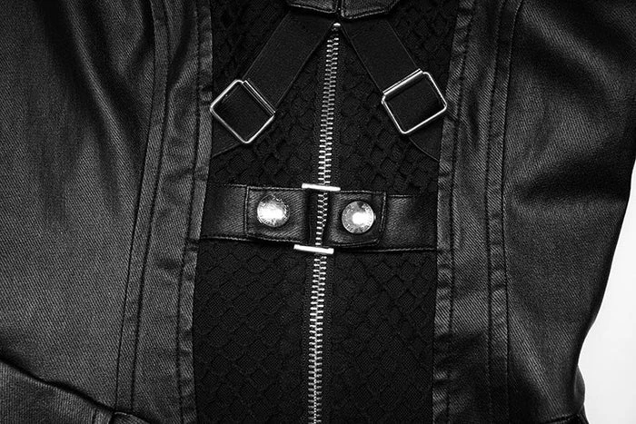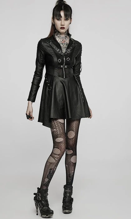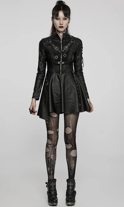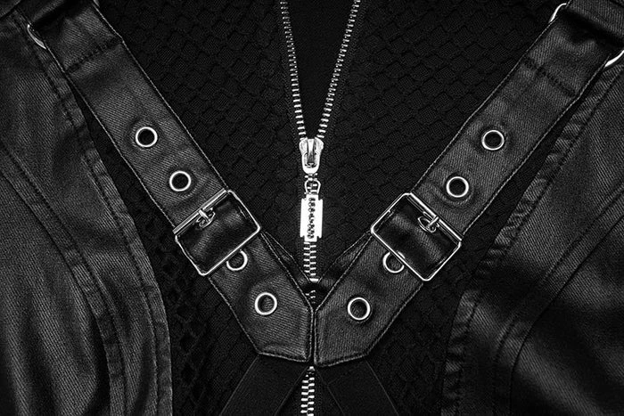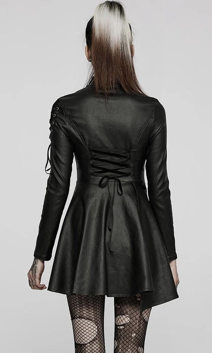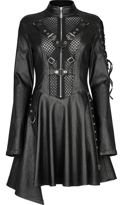 Look good, feel even better in the Sovereign dress! This Black elastic faux leather is so sexy and will make you feel like royalty! Featuring mesh panels with harness straps and corset detailing on the shoulder and back as well as an asymmetric hem line on this dress! You’ll be sure to turn heads when paired with some tights and heels!