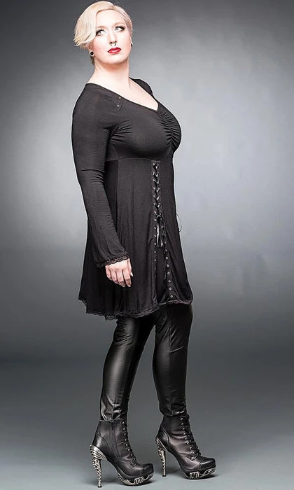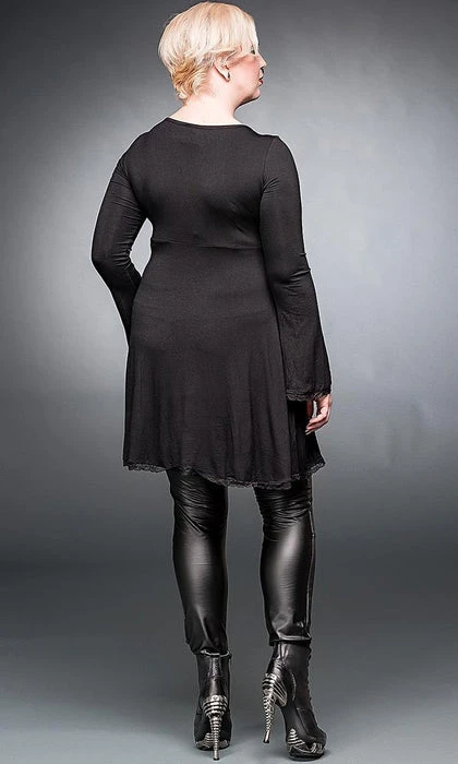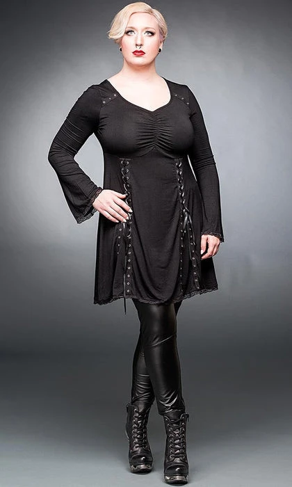 Feel like the hottest main character in this absolutely stunning little black dress, perfect and flattering for all bodies! Featuring small bell sleeves, a ruched top and lace up details on the dress, this will be perfect for a night out on the town with the ghouls!
