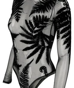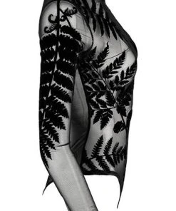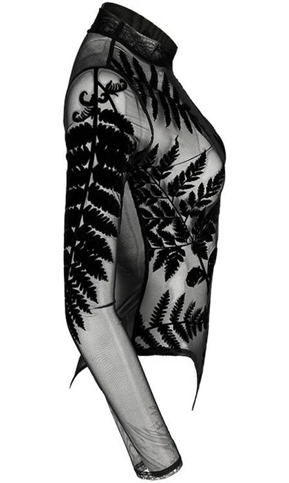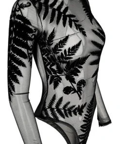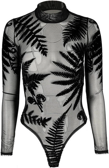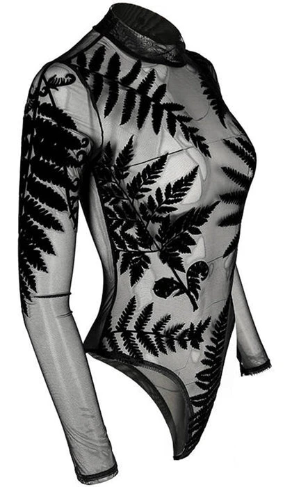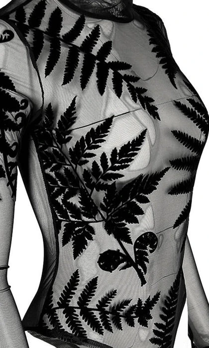 Incredible Gothic Ferns adorn this Forest Witch Mesh Bodysuit. The flocked velvet is soft to the touch and the sheer material is elegant and mystical! Featuring a clasp at the bottom, long sleeves and a high neck, this bodysuit looks incredible paired with high waisted pants or a skirt and a dark under top.