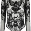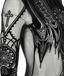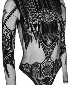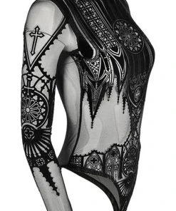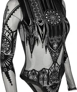 Incredible print inspired by gothic architecture adorn this Inverted Cathedral Mesh Bodysuit. The flocked velvet is soft to the touch and the sheer material is elegant and mystical! Featuring a clasp at the bottom, long sleeves and a high neck, this bodysuit looks incredible paired with high waisted pants or a skirt and a dark under top.