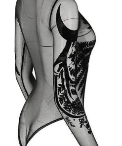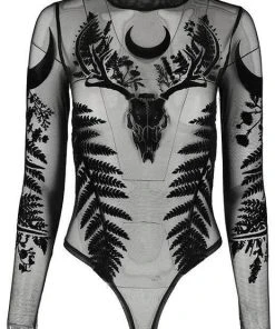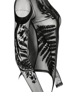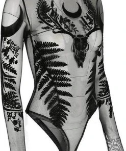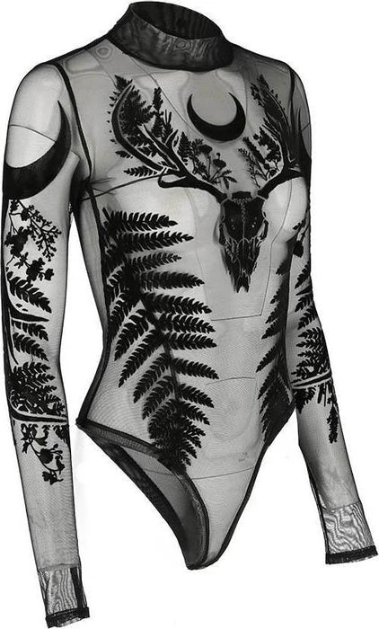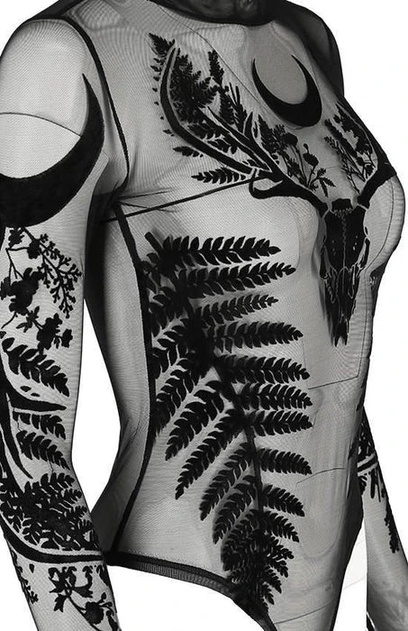 Incredible Gothic Ferns, and Antlers adorn this Black Mesh Bodysuit. The flocked velvet is soft to the touch and the sheer material is elegant and mystical! Featuring a clasp at the bottom, long sleeves and a high neck, this bodysuit looks incredible paired with high waisted pants or a skirt and a dark under top.