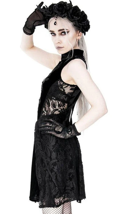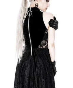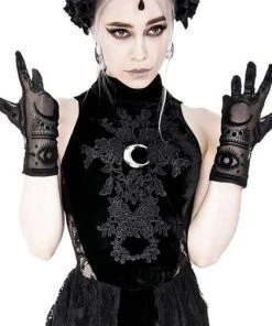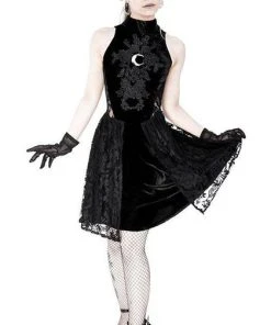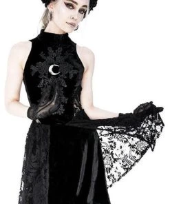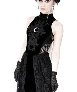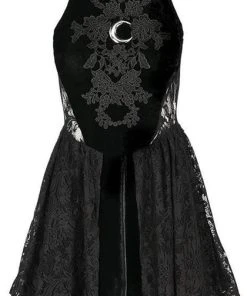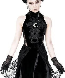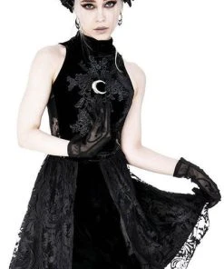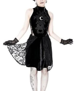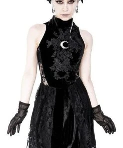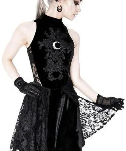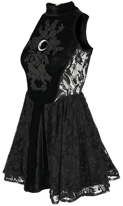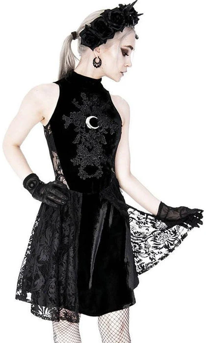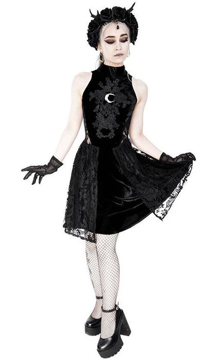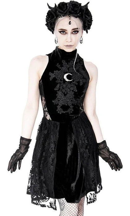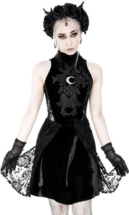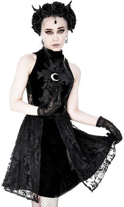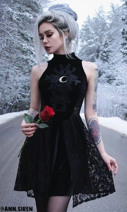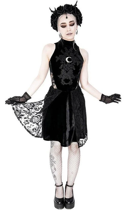 Inspired by Gothic Sailor Moon elements, this High Neck Crescent Moon Dress is perfect for dinners, dancing or simply basking in the moonlight. It features a beautiful soft velvet and lace design with a stunning silver crescent moon on the front.