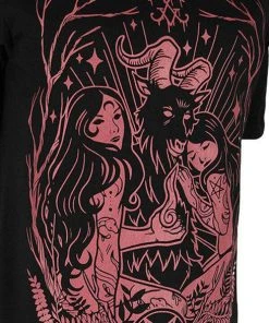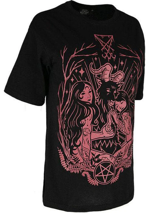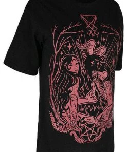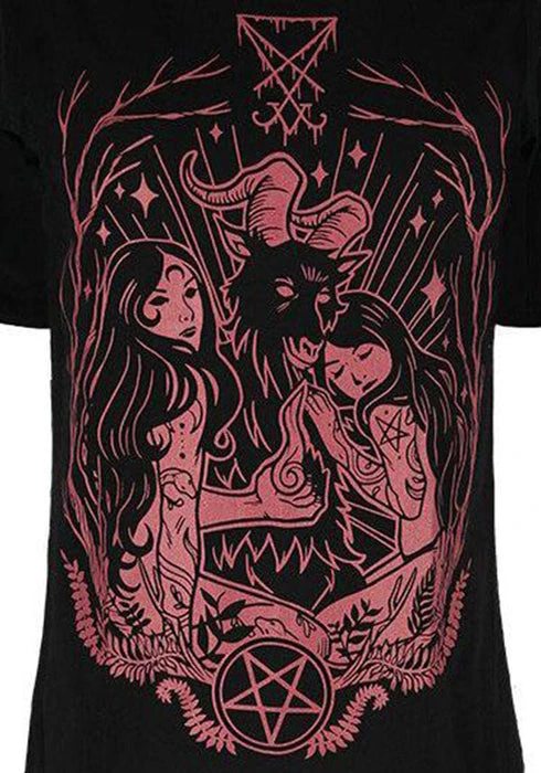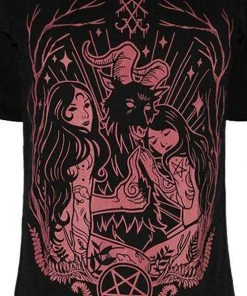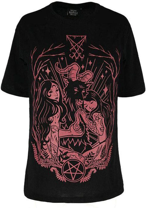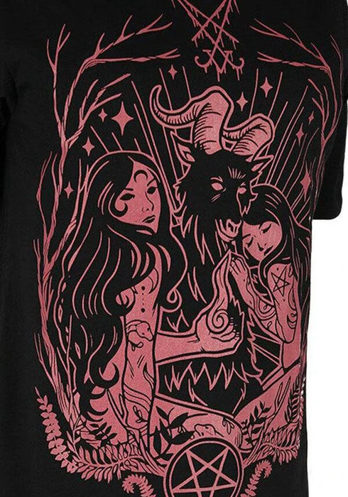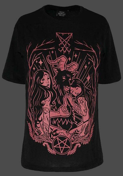 Show your devotion! This black T-Shirt features a Burgundy outlined design of Baphomet with two beautiful tattooed worshippers.