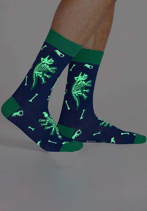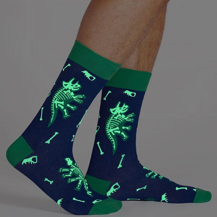 With years of discovery under your belt, you’ve never seen anything quite like this: GLOWING triceratops bones! You and the crew gently unearth the remains of this massive beast and start moving outward from it until a bony, stegosaurus plate glows from under the dust. More and more bones emerge from the depths of history and fill the site with a faint green light. What could cause such an anomaly? Did they glow before or after extinction? Will they stay this way in a museum environment? We don’t have the answers yet, but we can say the special thread will keep these socks glowing for a long time and Palaeontologists will really dig this sock—we can feel it in our bones.