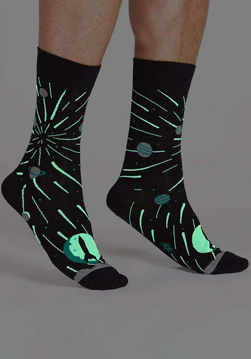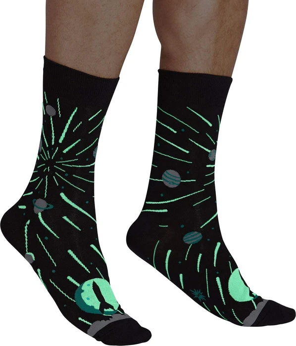 These socks glow in the dark! Hold them up to light or walk outside in the sun before turning off the lights to watch the special thread glow.