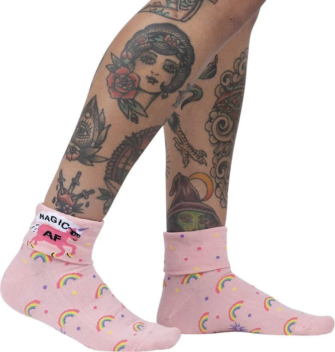Did you know these cute turn cuff crew socks can be worn two ways? Show off a field of rainbows when you wear them up, or you can fold them down to reveal a secret message and stylin’ unicorn! Our Magic AF Turn Cuff Crew Socks aren’t guaranteed to give you actual magic powers, but they’ll give you a ton of confidence, which is kind of the same thing. Rock them with any outfit and know you’re an incredible being full of individual magic.