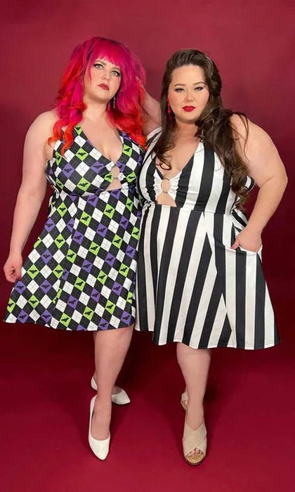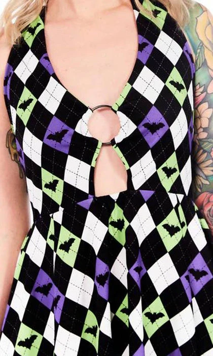 The new Bat Argyle Peekaboo Halter dress isn’t a want, it’s a NEED! This amazing swing dress has it all; a halter neckline with an o-ring detail, peekaboo cutout, smocked back bodice, and pockets! Not to mention an absolutely amazing green and purple bat argyle print – there’s no way you can resist! Pair it with some fishnets and some heels for a stunning look.