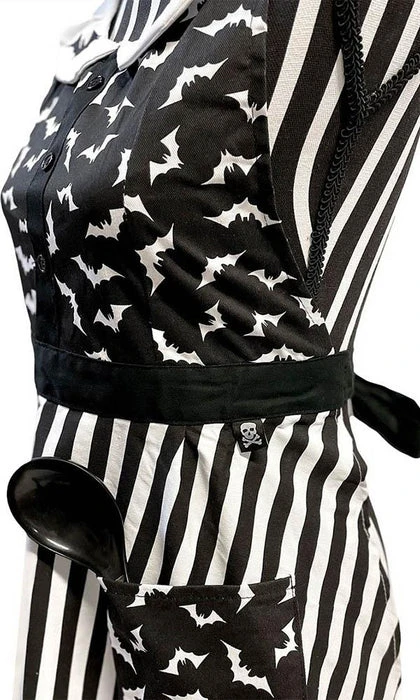 Get dolled up, even at home! Home chefs can rejoice – Sourpuss have brought the favourite Luna Bats pattern to the kitchen! This Sourpuss apron features a cute peter pan collar, buttons, and two large front pockets. It will keep the food spatters off of you, while still showing your personality!