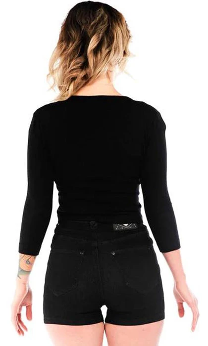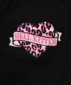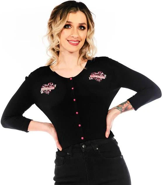 Meow! The new Hell Kitten cropped cardigan is purrrfect for all you pinup babes out there! This soft and stretchy cardigan features a pink leopard print heart with “Hell Kitten” embroidered on both chest panels, and hot pink matching buttons. This looks so cute paired with high waist capris or skirts!