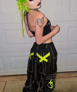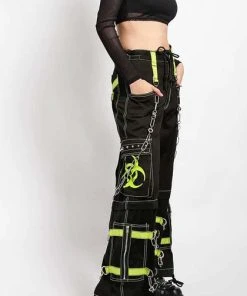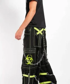 Accept no imitations! From the originator of all things DarkStreet, these black and lime studded pants zip off into shorts and feature a biohazard symbol on each leg, removable chains, adjustable ankles, D-rings, and deep pockets.