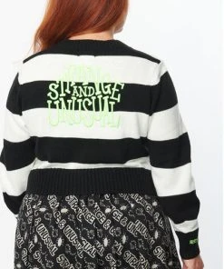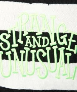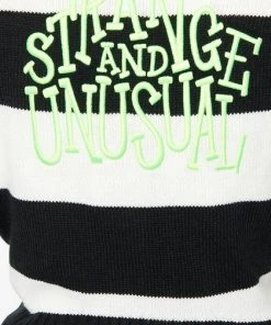 Crafted in a soft sweater knit with black and white stripes. The long sleeve cardigan boasts the words ‘ Strange and Unusual’ embroidered in green on the back.
