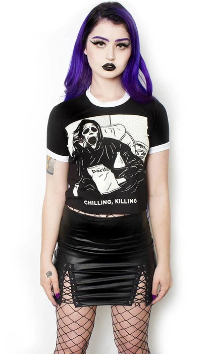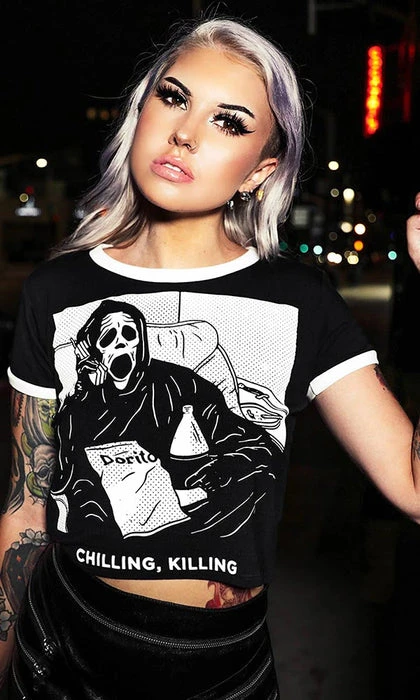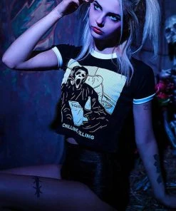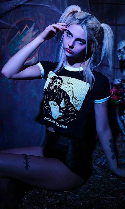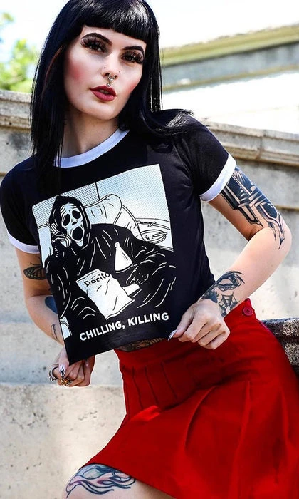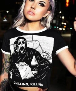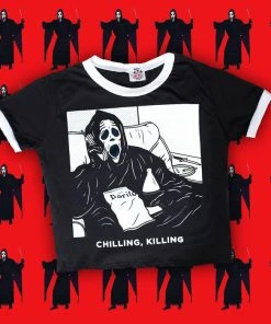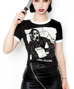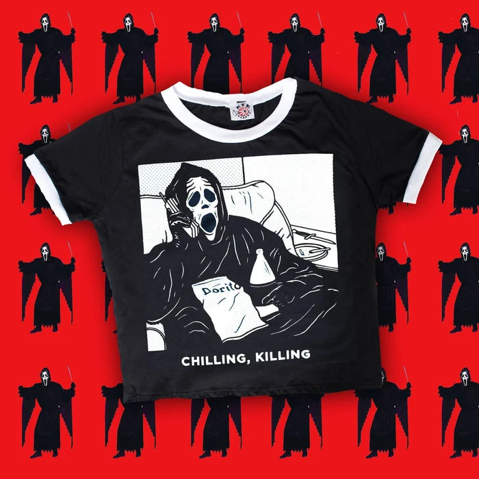 A cute take on the slasher parody ‘Scary Movie’, this soft and lightweight cropped shirt features an iconic graphic print of ghost face and will make you look, and feel awesome! Pair this with ripped jeans and combat boots for a super cute, casual look.
