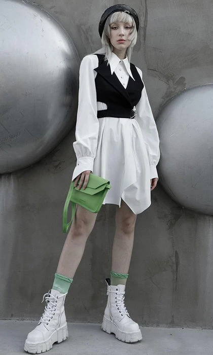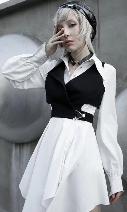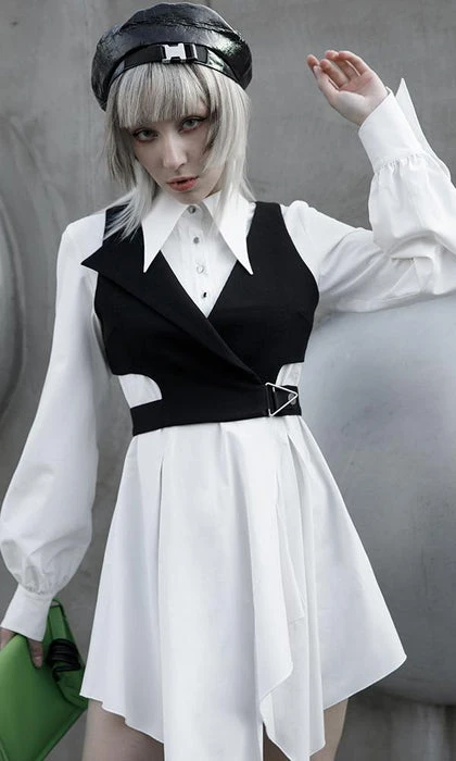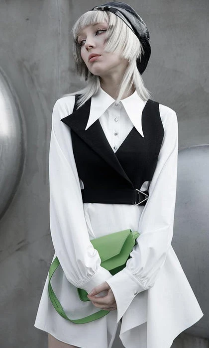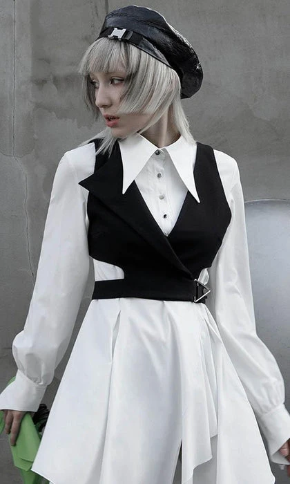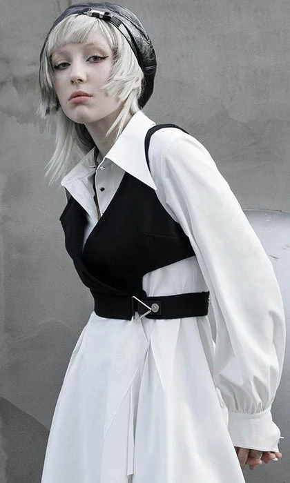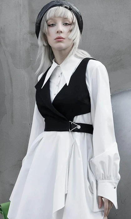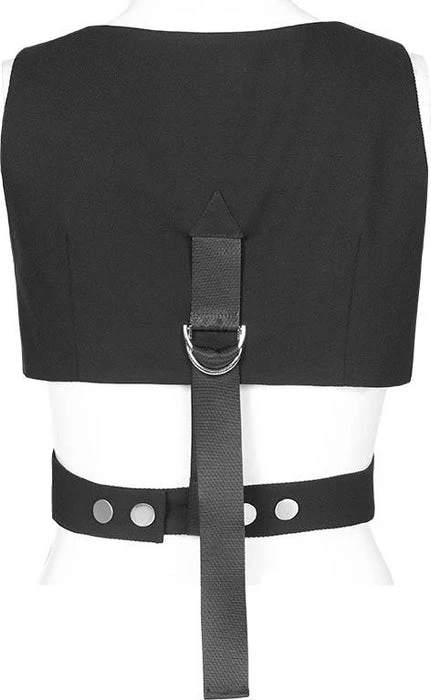 Modern Gothic Styling with Punk elements create this stunning Enigma Vest! Featuring a Sharp Lapel Collar, Cut out Panelling and Metal Hardware. The asymmetrical design looks incredible layered over dress shirts and paired with monochromatic tones!