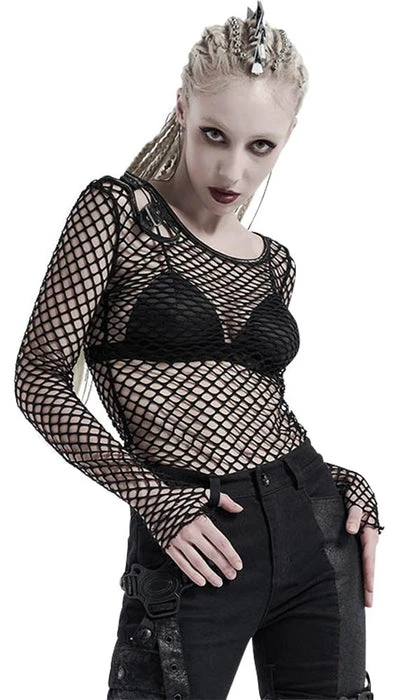 Unleash your inner Punk! The slim fit Vicious Top is made out of black elastic fishnet fabric and features two glossy fabric straps with silver buckles and eyelets on the left shoulder. Long sleeves complete this dramatic look – slide your fingers into the mesh and wear them as fingerless gloves.
