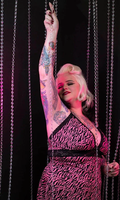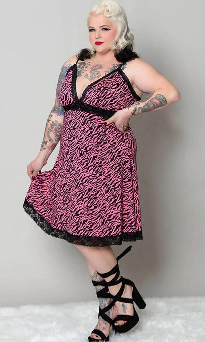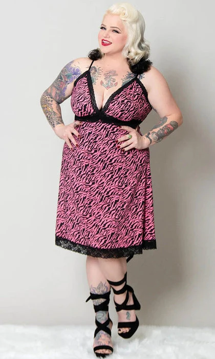 Rowr! The new Pizzazz slip dress in Pink Zebra is as badass as it gets! This ultra stretchy, slinky slip dress is made out of a soft, slightly shiny knit jersey and is trimmed in soft black lace. It also has adjustable bra-style straps for a perfect fit! We love this dress paired with fishnets, boots, and a chunky cardigan!