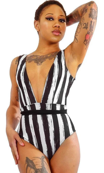 This Black & White Distressed Stripe One Piece is giving Vintage Hollywood glam vibes! Features a sexy low cut in the front & snatched waist, this style and fit will look glamorous on all body types.