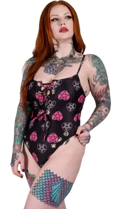 We can love pentagrams and frills at the same time, right? Definitely! Go all out girly in Too Fast’s cute pastel goth ruffled pentagram heart swimsuit! This swimsuit also features some eyelets to adjust the fit of the suit, which gives it a unique look.