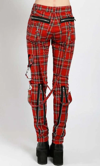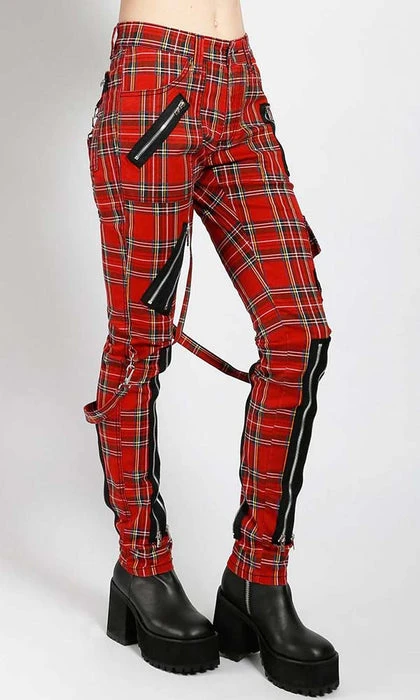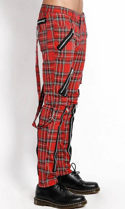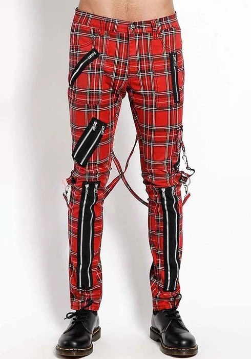 These red plaid pants were made for rocking out in. A punk rock wardrobe wouldn’t be complete without these classic slim leg pants with removable bondage straps and zipper details. Pant legs can be zipped for a change in fit, topped off with a zip fly and button closure.