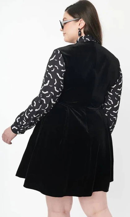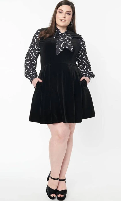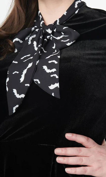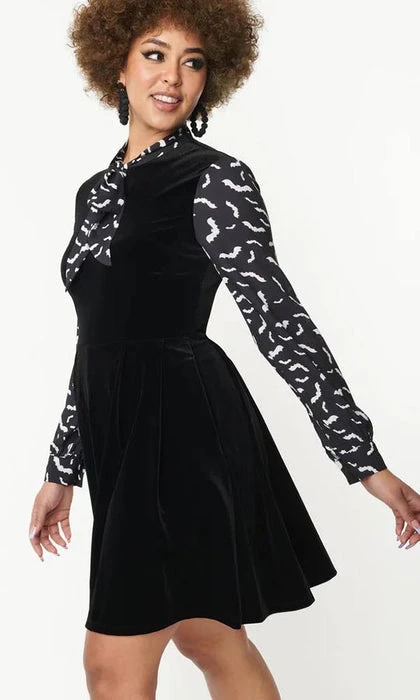 This bewitching flare dress is crafted in black velvet, framed by black long crepe sleeves and centered by a self tie neck bow that feature a spooky print of white bats. Outfitted with a back zipper and side pockets.