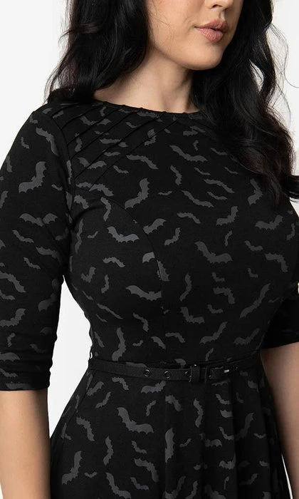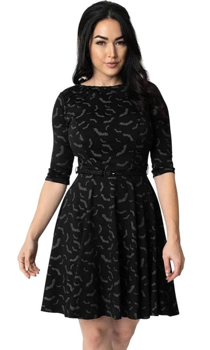 You’ve got some bats in the belfry, darling! Show off your colony of flying familiars in this retro-inspired dress from Unique Vintage. A flattering fit and flare frock in a thrilling black sturdy stretch fabric blend and featuring a fluttering screen print of grey bats throughout. Princess seams lend a comfortable and flattering fit as symmetrical pintucks on the shoulders make for a streamlined and deliciously detailed look. Silhouetted with three-quarter length sleeves and cinched at the waist with a removable belt so you won’t bat an eye as you bewitch new company!