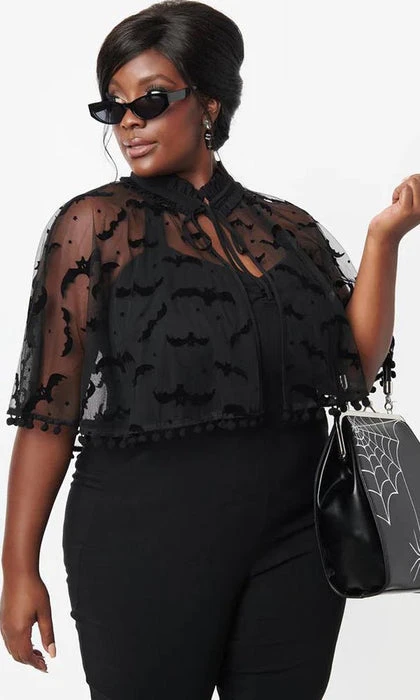 This frightening cute capelet is crafted in a marvellous black mesh that dances with flocked bats and stars throughout. The classic collar is accented with a sweet ruffle, and is centered with attached ties!