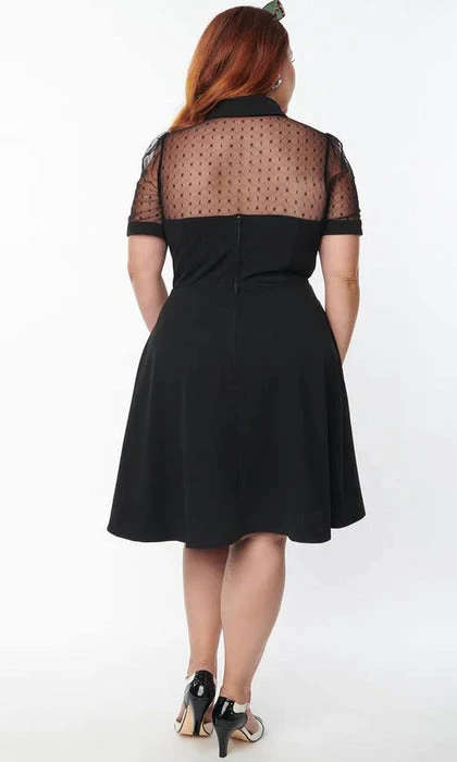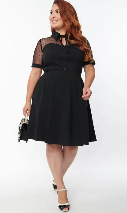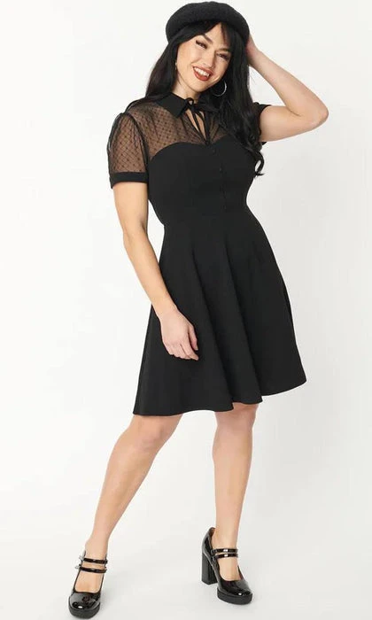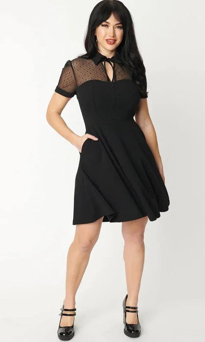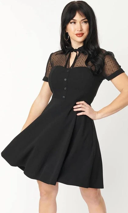 This endearing flare dress is crafted in a black woven fabric with stretch. Outfitted with an illusion neckline in black mesh topped with a classic collar and self tie bow. Complete with faux buttons, mid back zipper, and side pockets