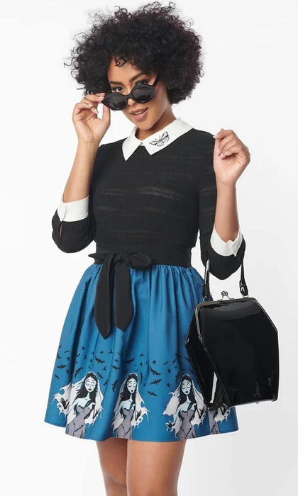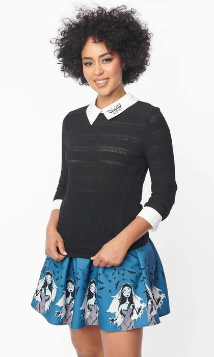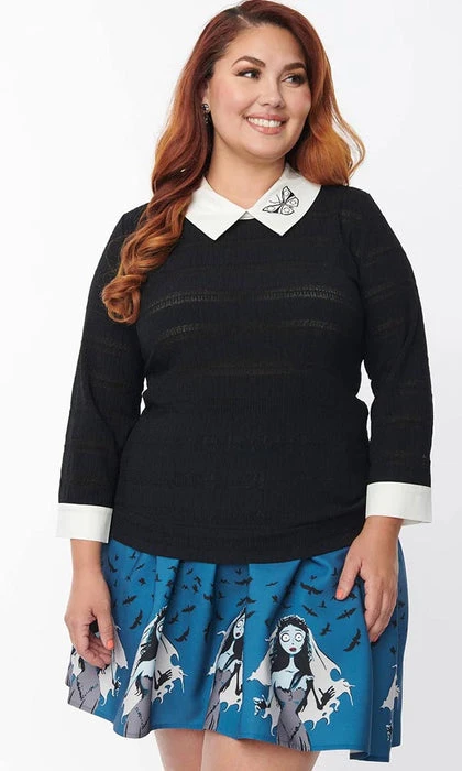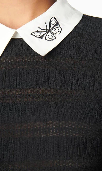 This chic sweater, in collaboration with Corpse Bride, is crafted in a fabulous black perforated knit while the solid white collar is accented by embroidery of a butterfly. Secured in the back with a button keyhole while the three-quarter length sleeves drop into solid white button cuffs!